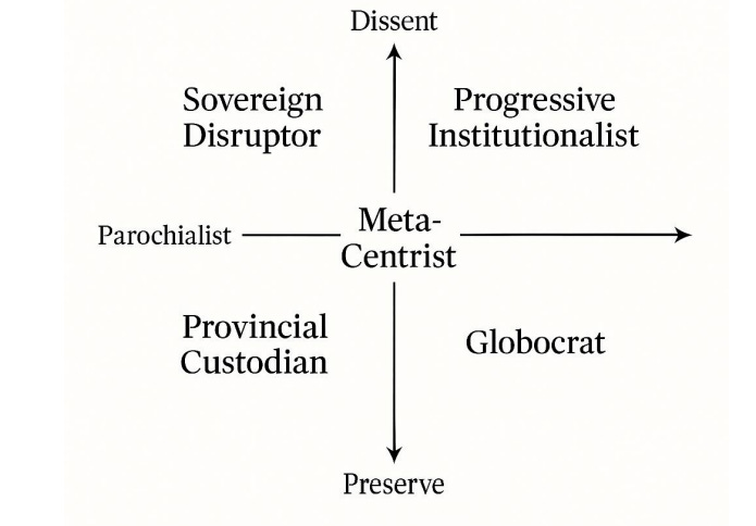 Together, these axes create five archetypes: Sovereign Disruptors, Provincial Custodians, Globocrats, Progressive Institutionalists, and a redefined Centre.
